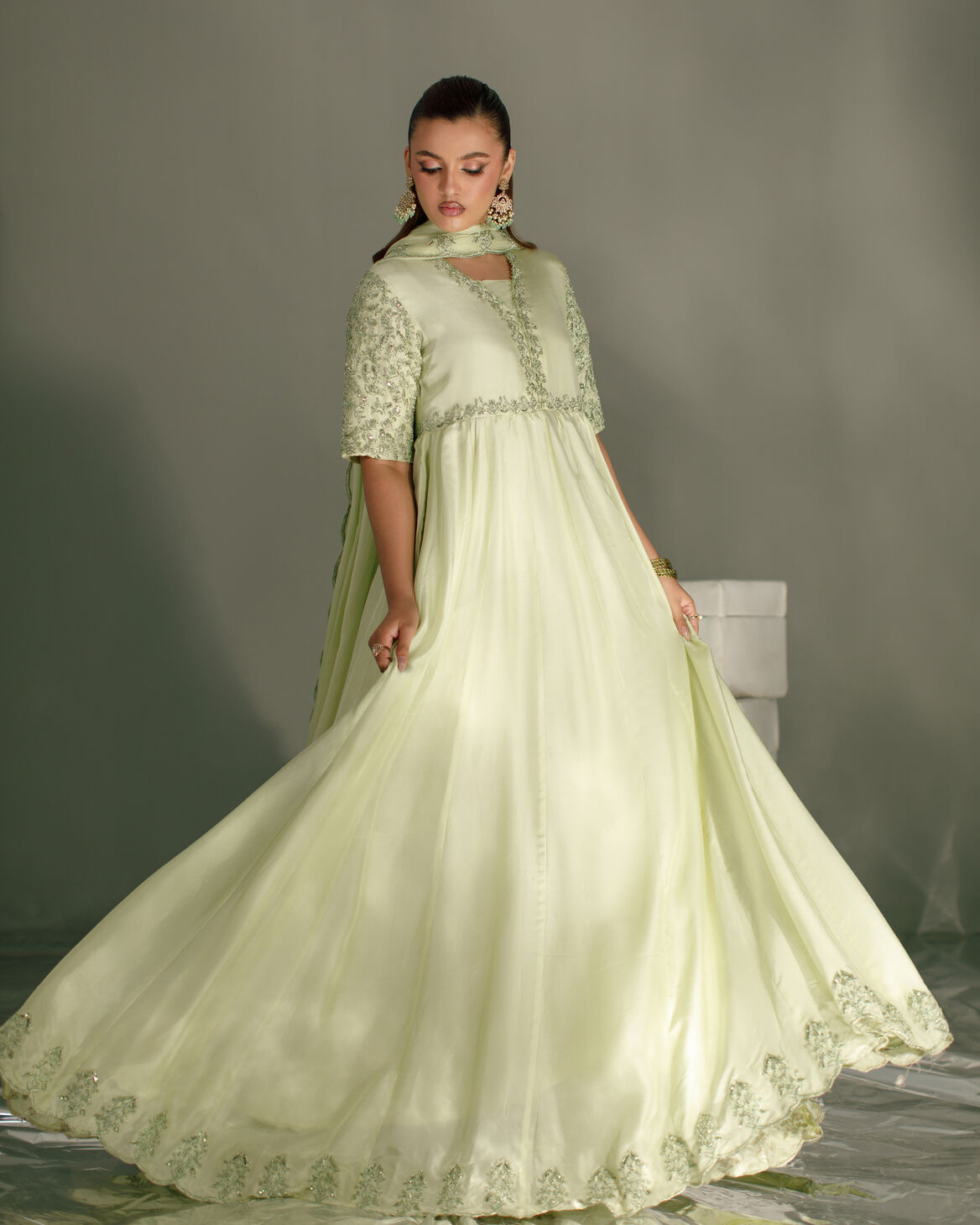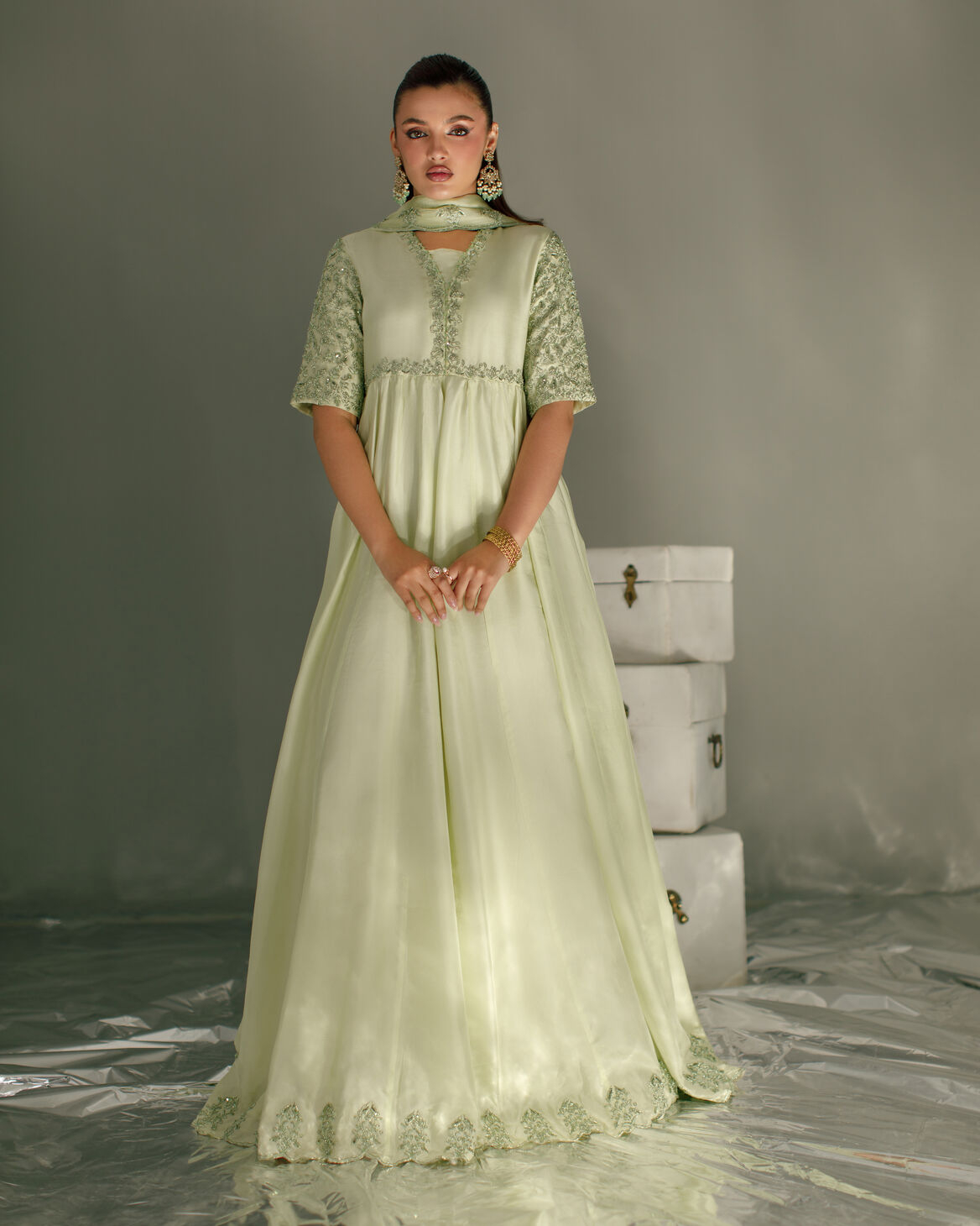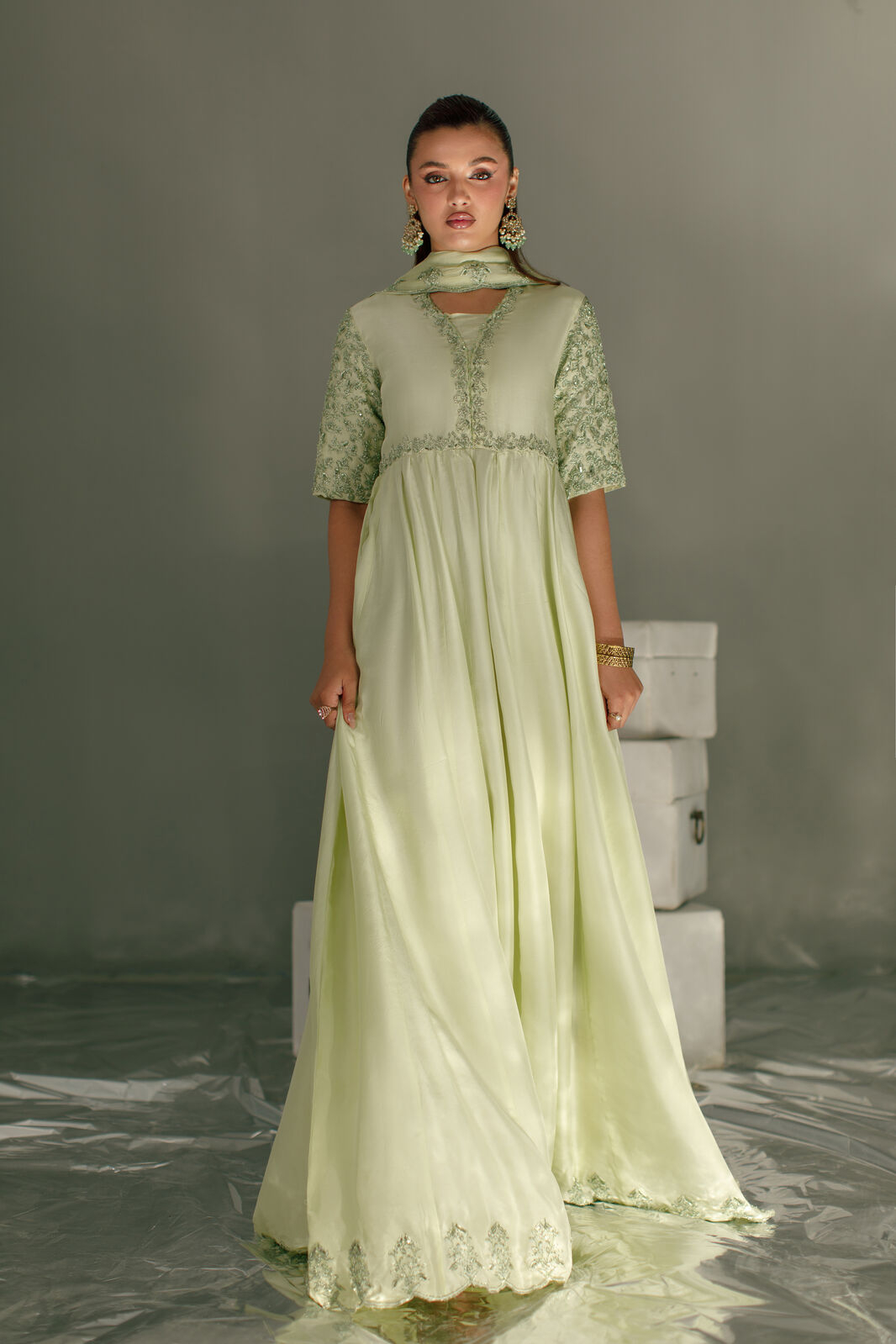 Product Details: Elegant panelled maxi frock in tassels silk fabric, styled with trendy short sleeves and finished with subtle tassel accents. Intricately detailed with self handwork and machine embroidery for timeless festive sophistication. Paired with a silk dupatta with delicate embellishments, completing the look with effortless charm.