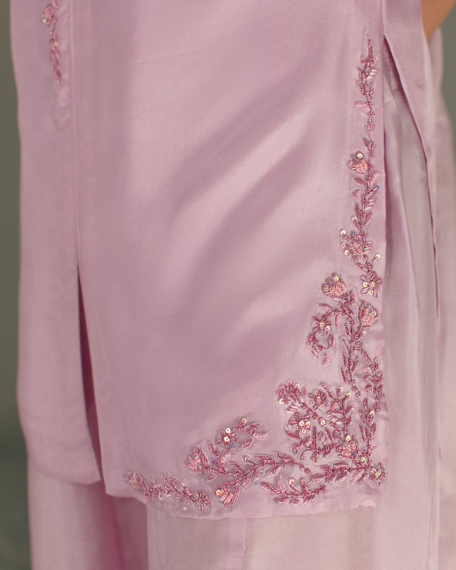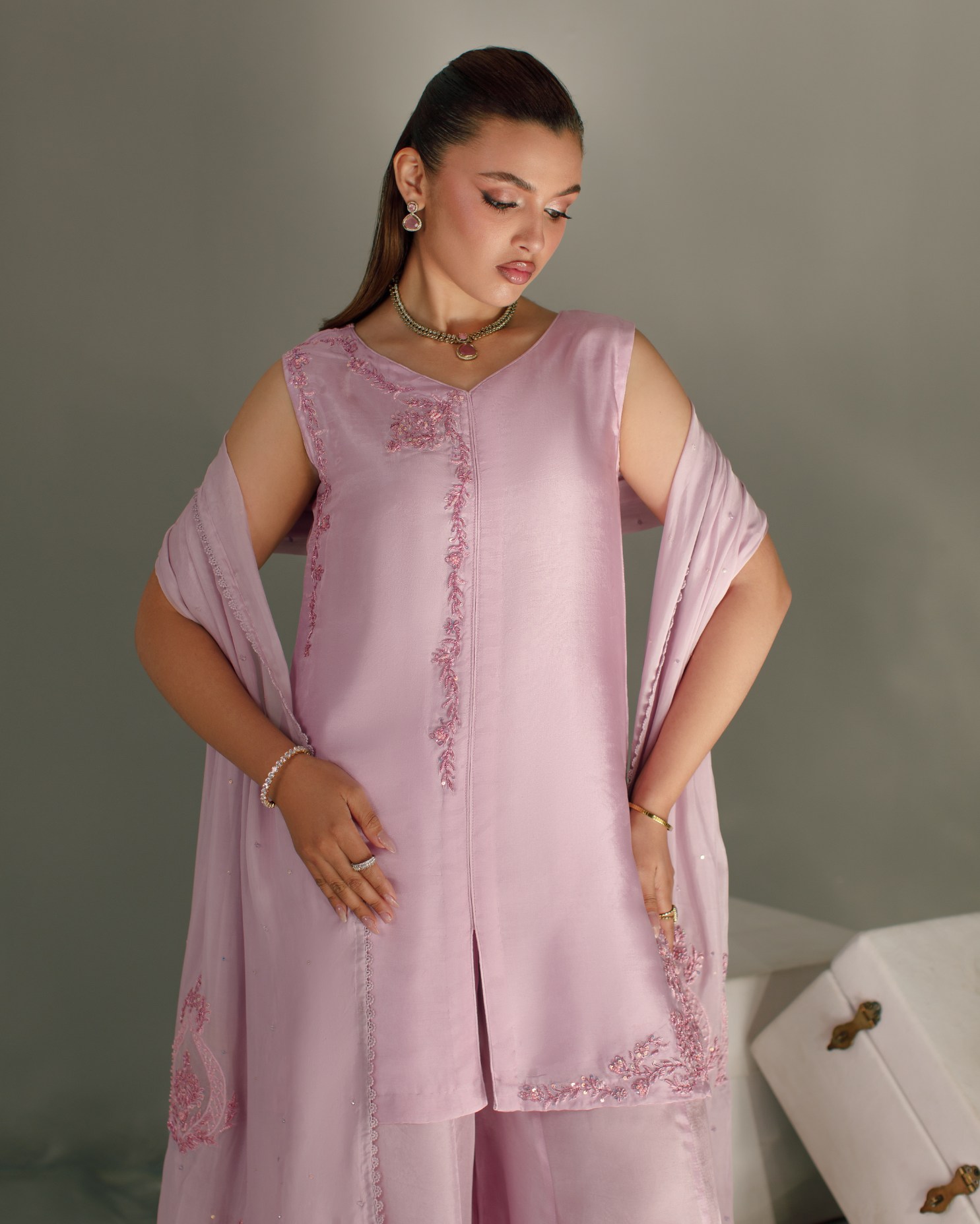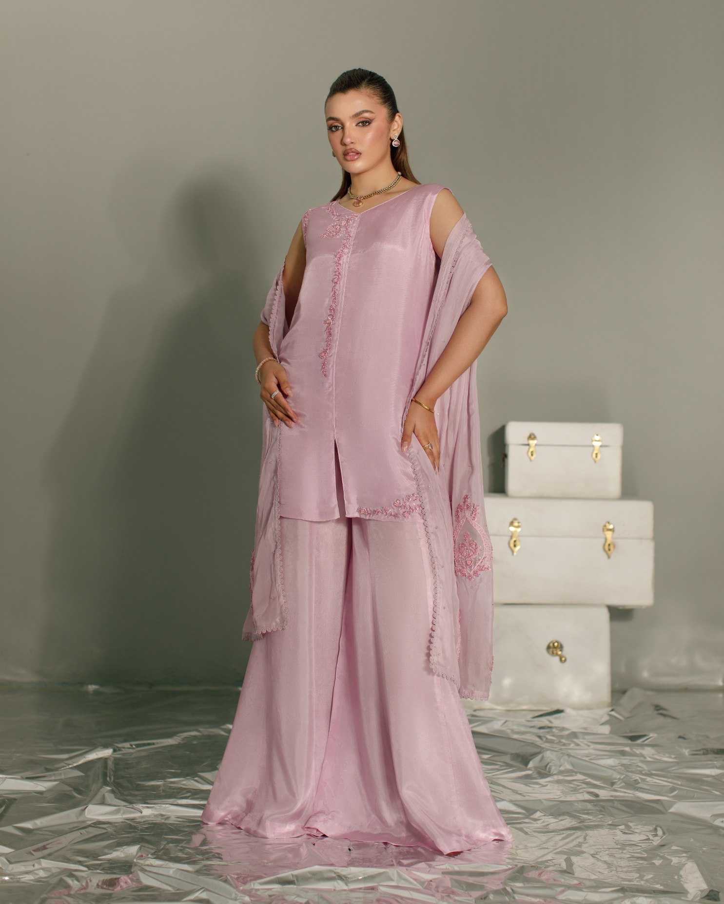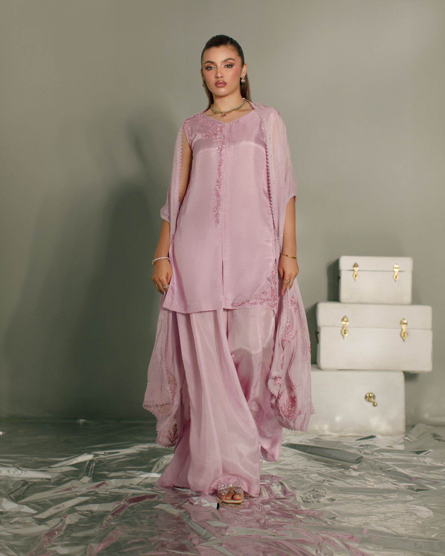 Product Details: A delicate festive statement in pastel lilac. This elegant look features sharara pants paired with a sleeveless front open shirt, beautifully adorned with machine and hand embroidery enhanced with classic zardozi work. Intricate motifs along the neckline create a graceful focal point, while side daman detailing adds refined craftsmanship to the silhouette. Styled with a soft dupatta finished with appliqué work, bringing texture and timeless festive elegance to the ensemble.