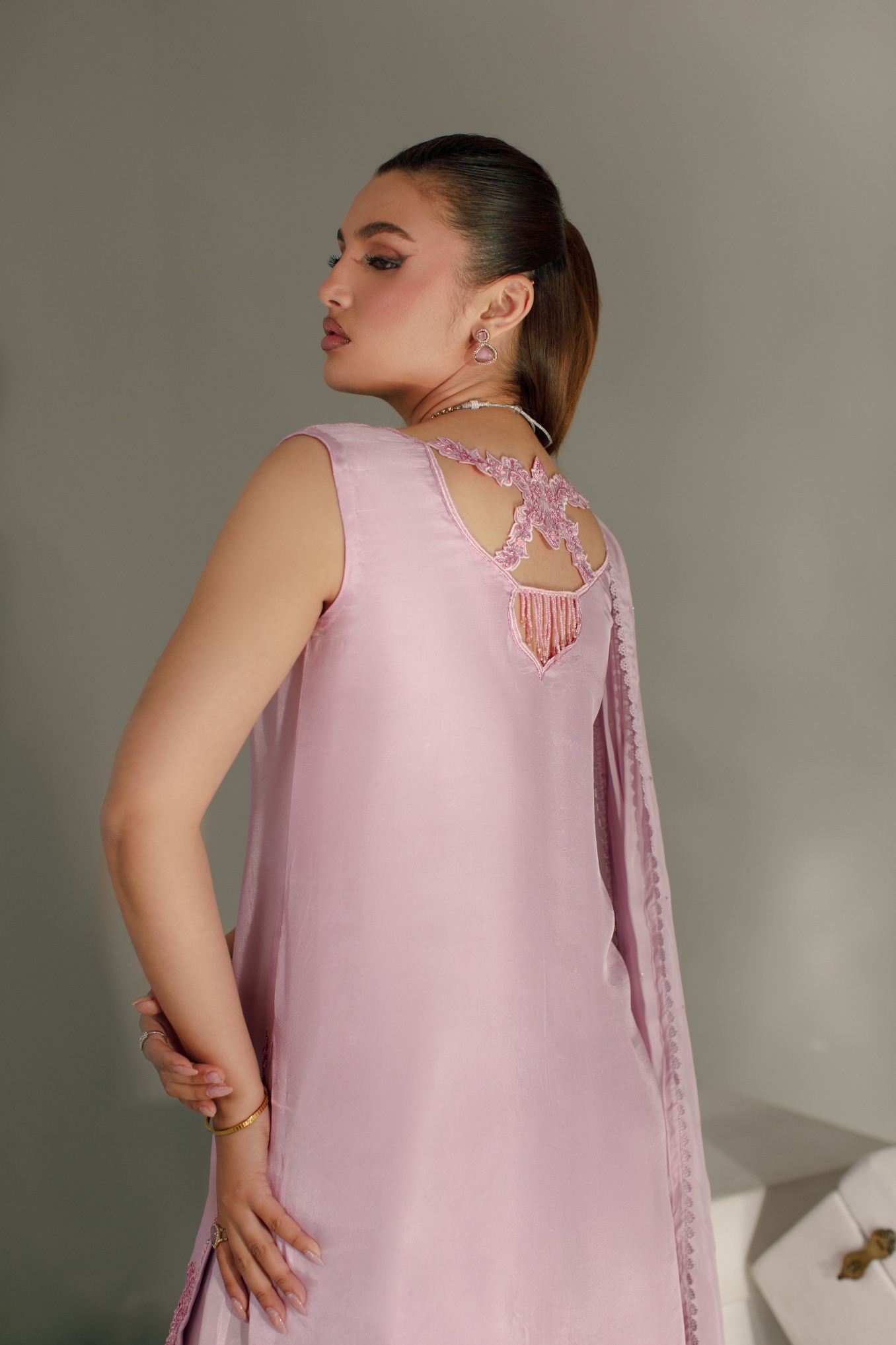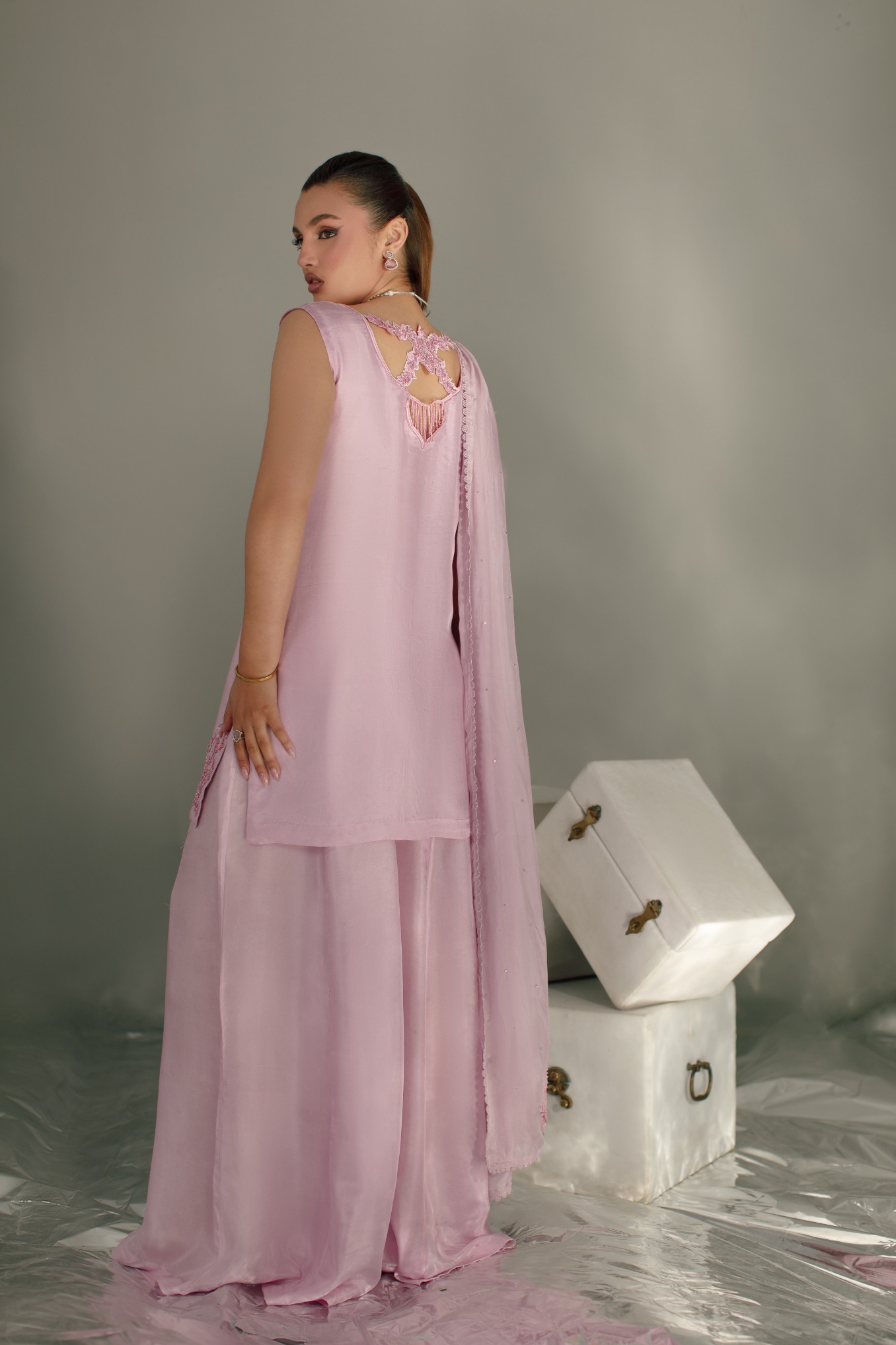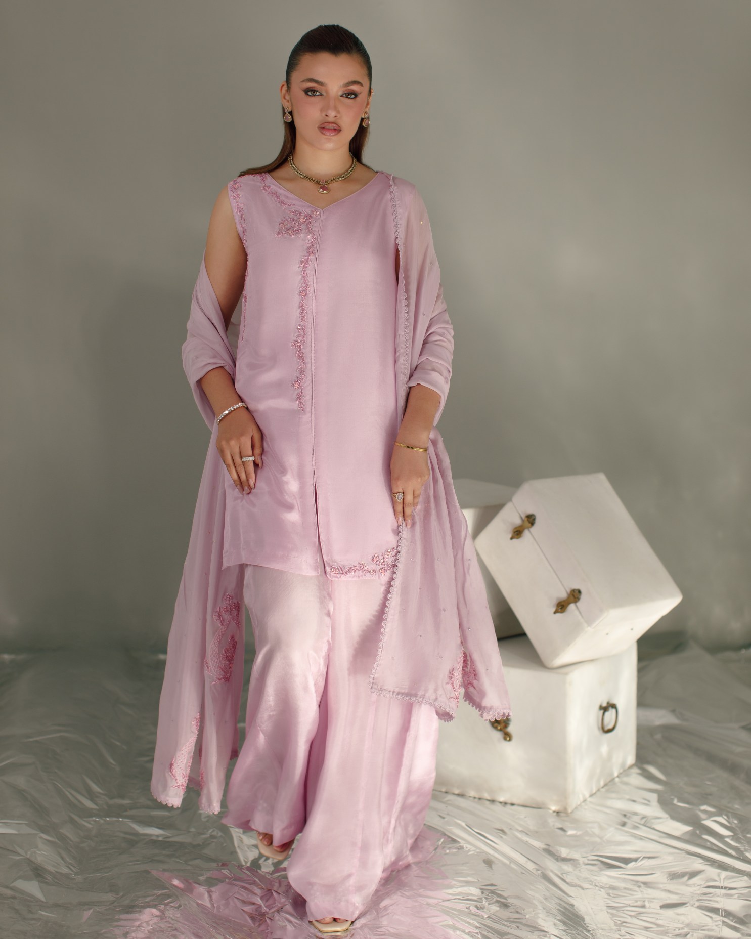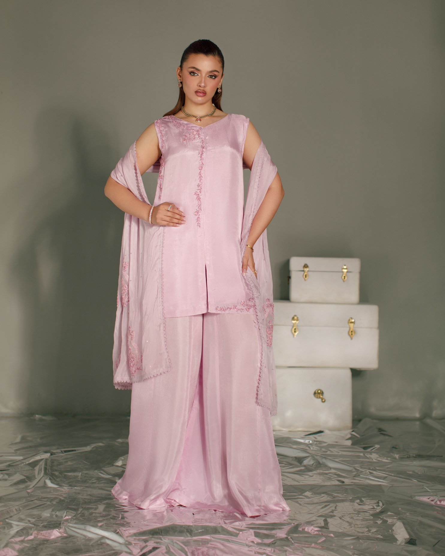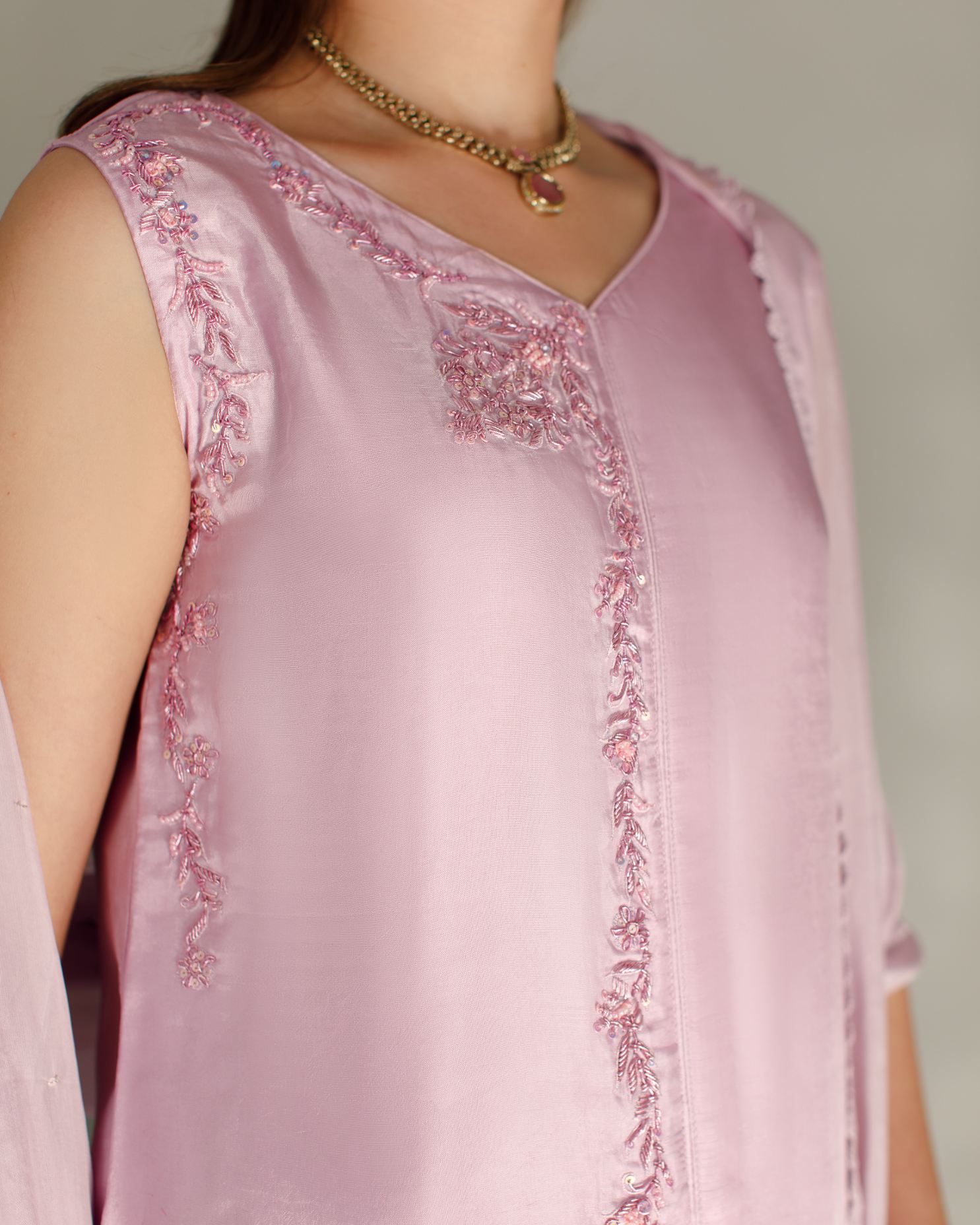 Product Details: A delicate festive statement in pastel lilac. This elegant look features sharara pants paired with a sleeveless front open shirt, beautifully adorned with machine and hand embroidery enhanced with classic zardozi work. Intricate motifs along the neckline create a graceful focal point, while side daman detailing adds refined craftsmanship to the silhouette. Styled with a soft dupatta finished with appliqué work, bringing texture and timeless festive elegance to the ensemble.