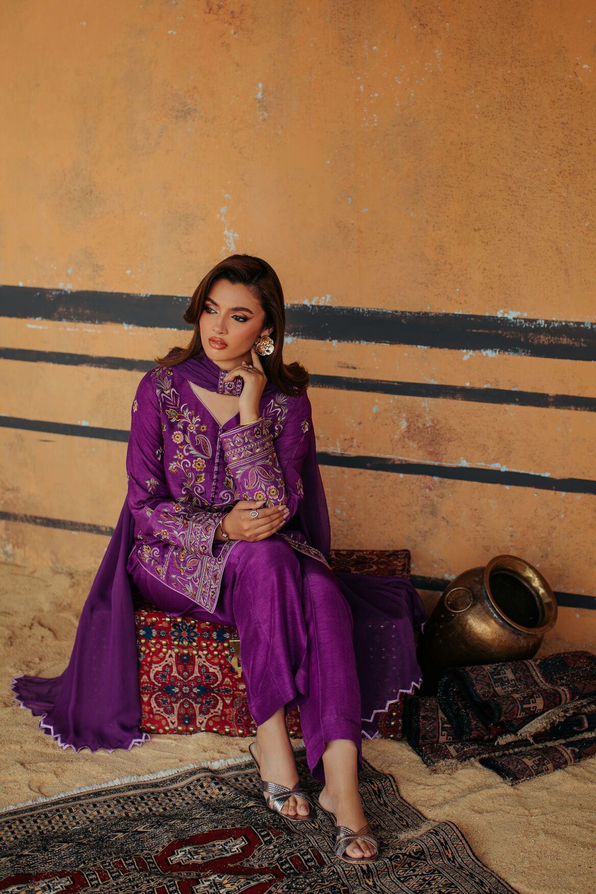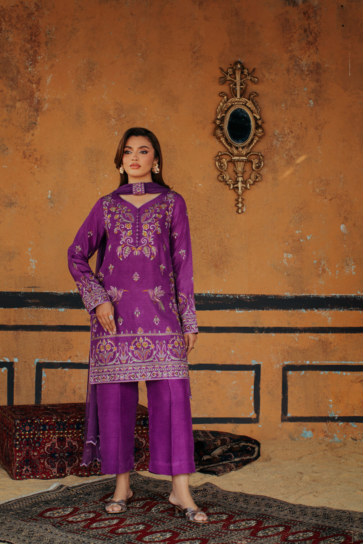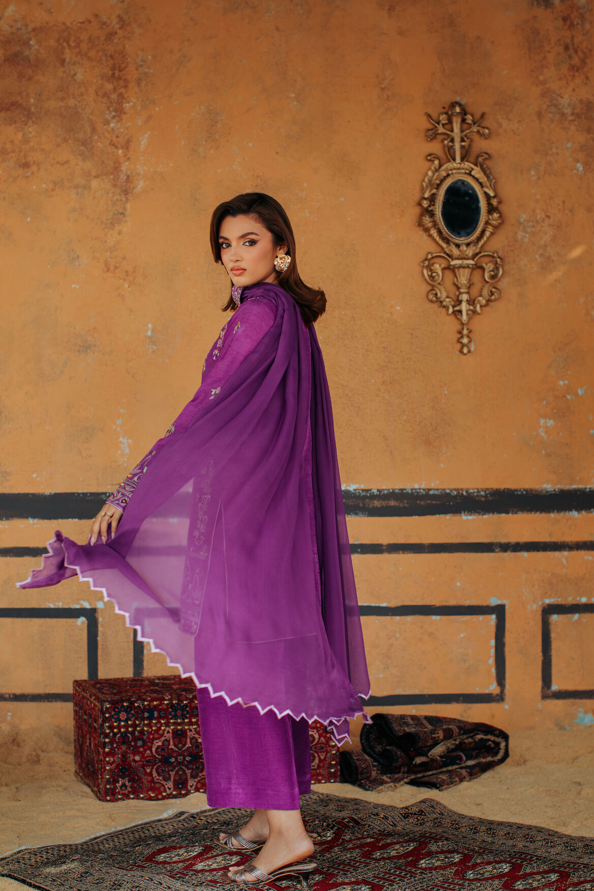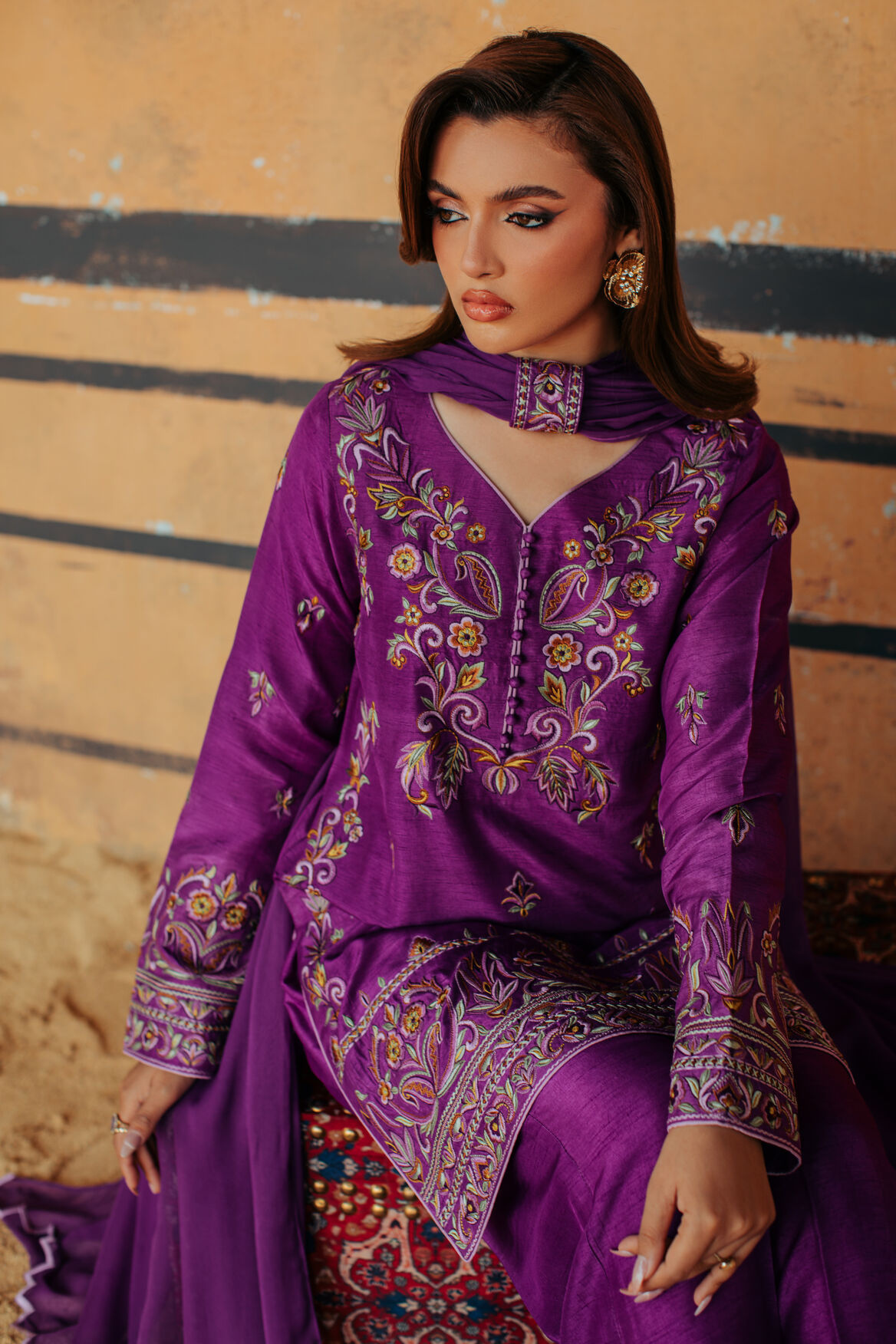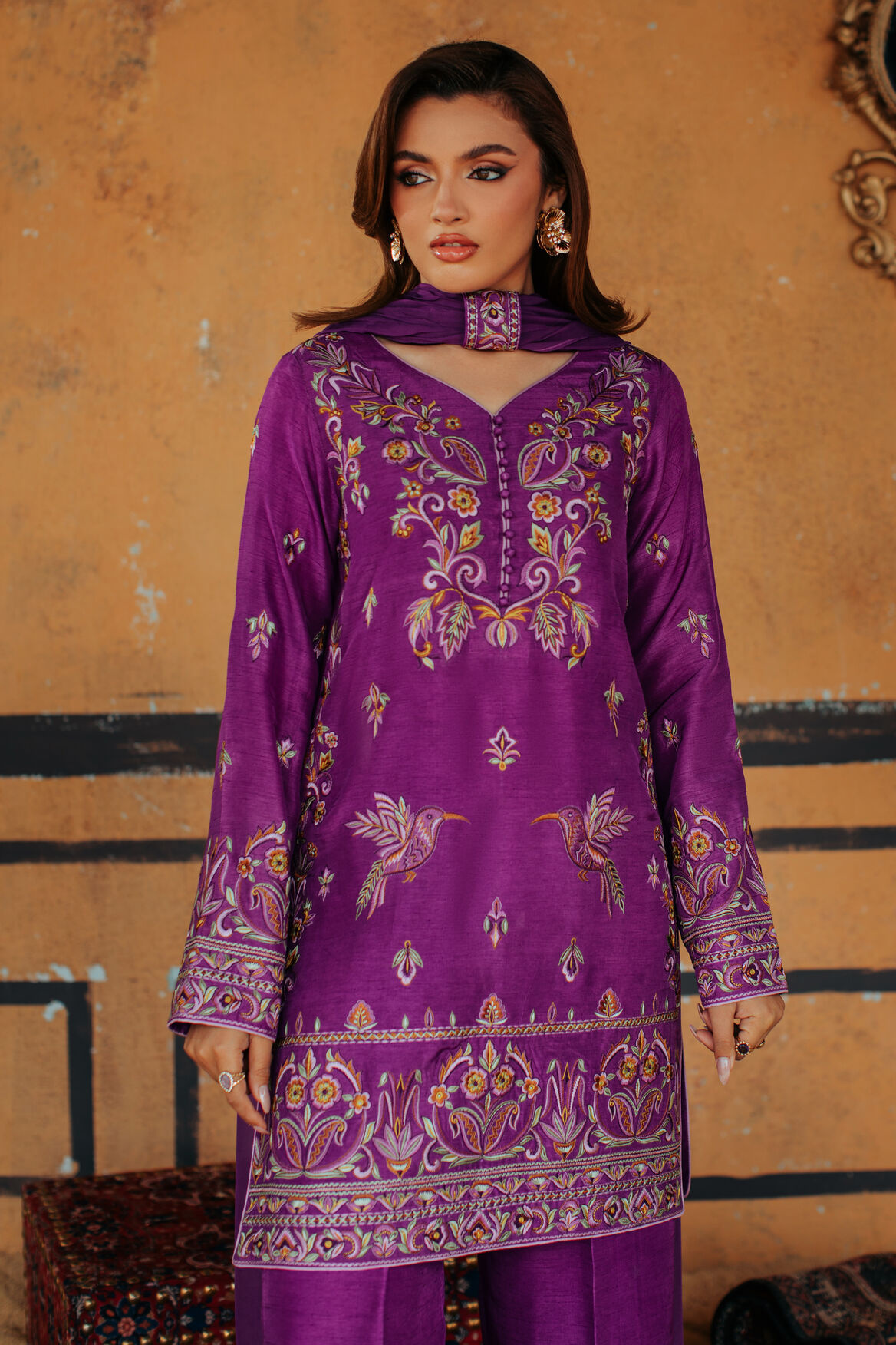 Product Details: A vibrant purple ensemble designed with a chic short shirt and structured box trouser. The look is elevated with colorful embroidery across the outfit, creating a bold festive statement. The dupatta features delicate corner cutwork, finished with a beautifully designed embroidered patti for an elegant folded drape.”