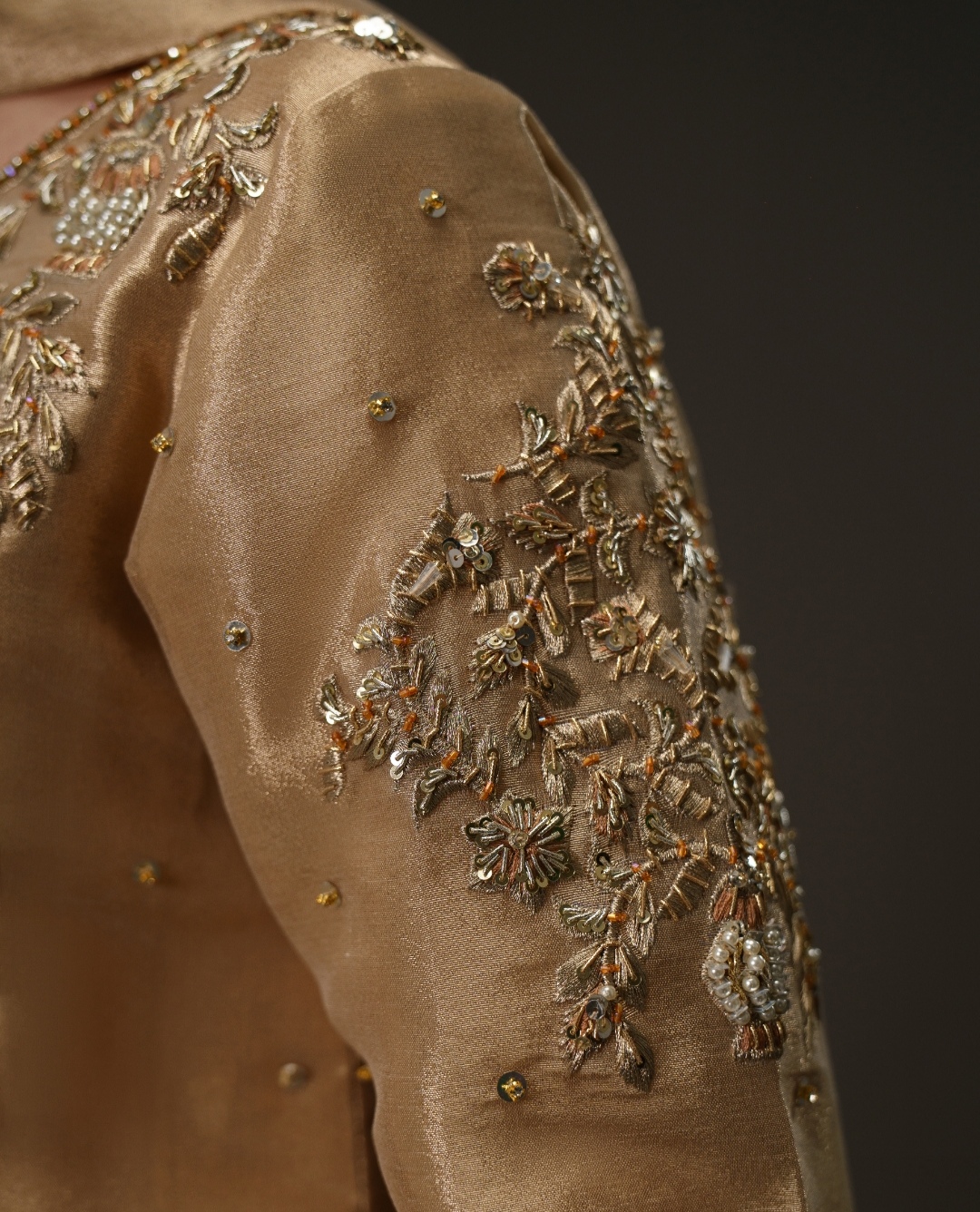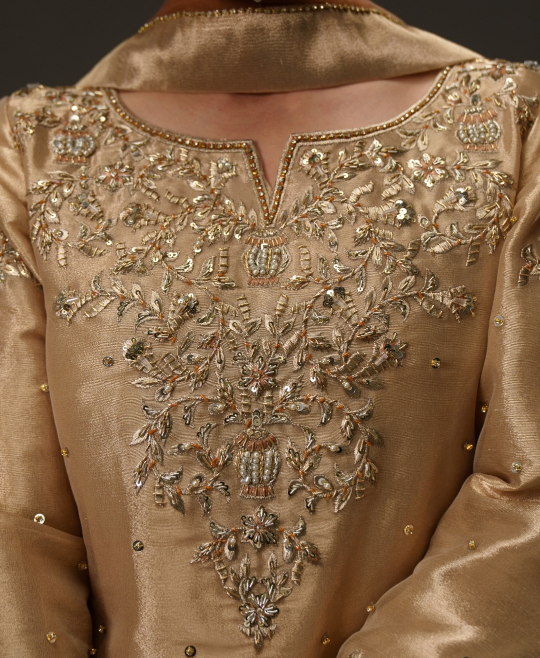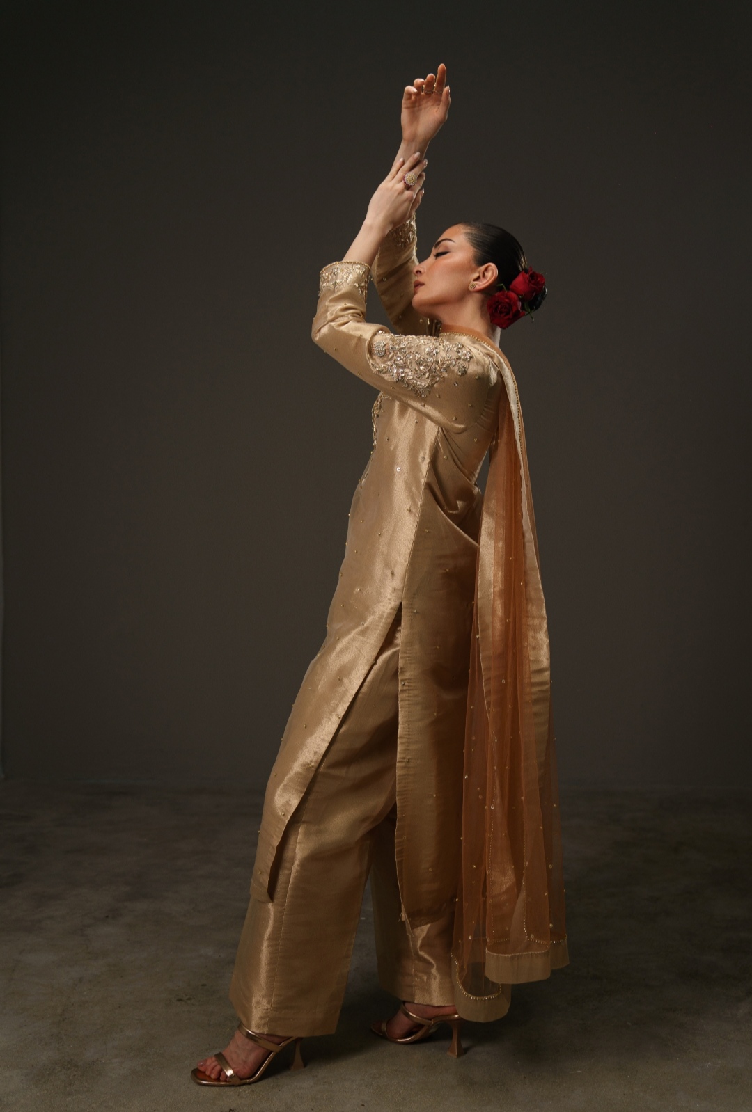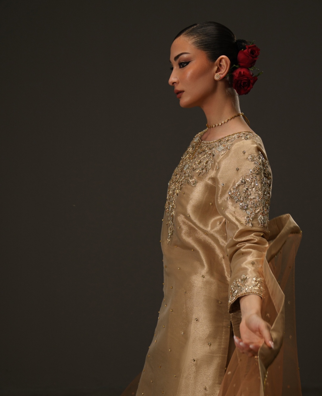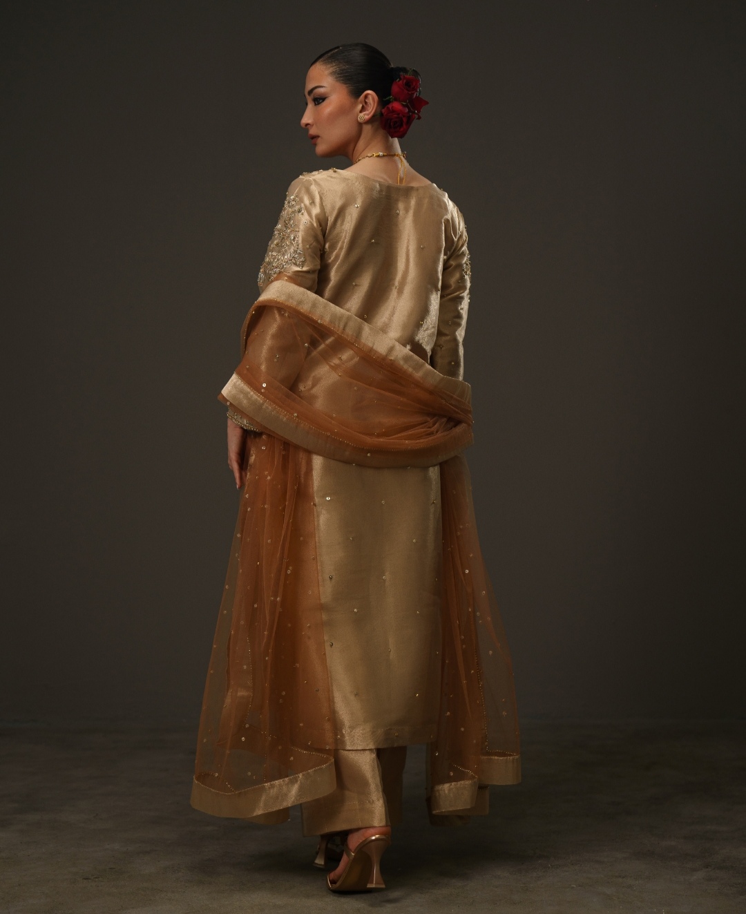 Product Details: The lama tissue shirt and trouser paired with an airy net dupatta, finished with intricate handwork and zari detalling.